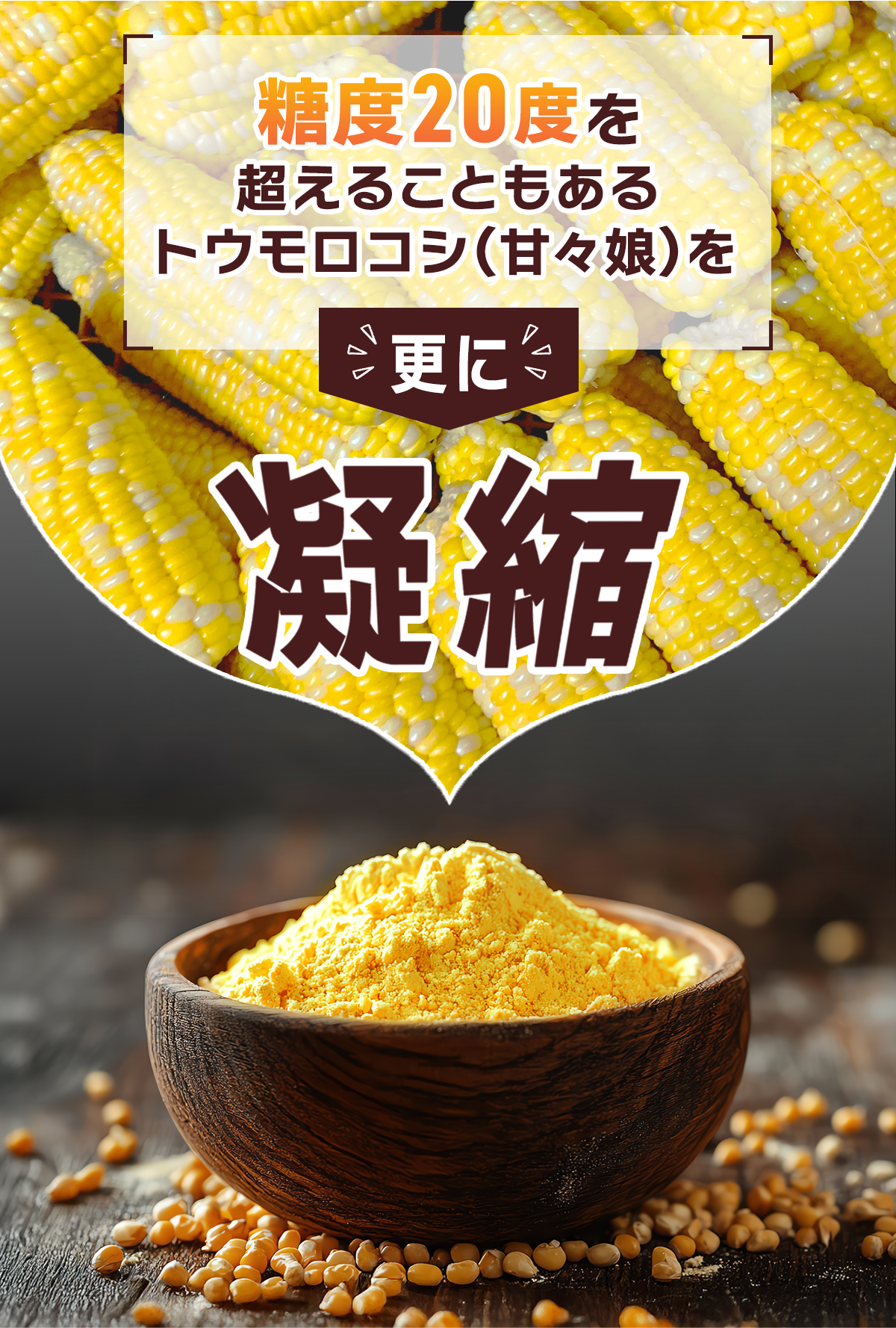【甘乾娘】は、静岡県森町で収穫したトウモロコシ(100%)を乾燥させ粉末化したトウモロ コシ粉です。 素材のトウモロコシを乾燥させることで、甘味と旨みが凝縮され、細かく粉砕することで食感も 滑らかでクリーミーな味わい 塩と牛乳だけで濃厚なコーンスープとなり、ケーキなどのお菓子に使用すると濃厚なトウモロコ シの風味を加えることができます。